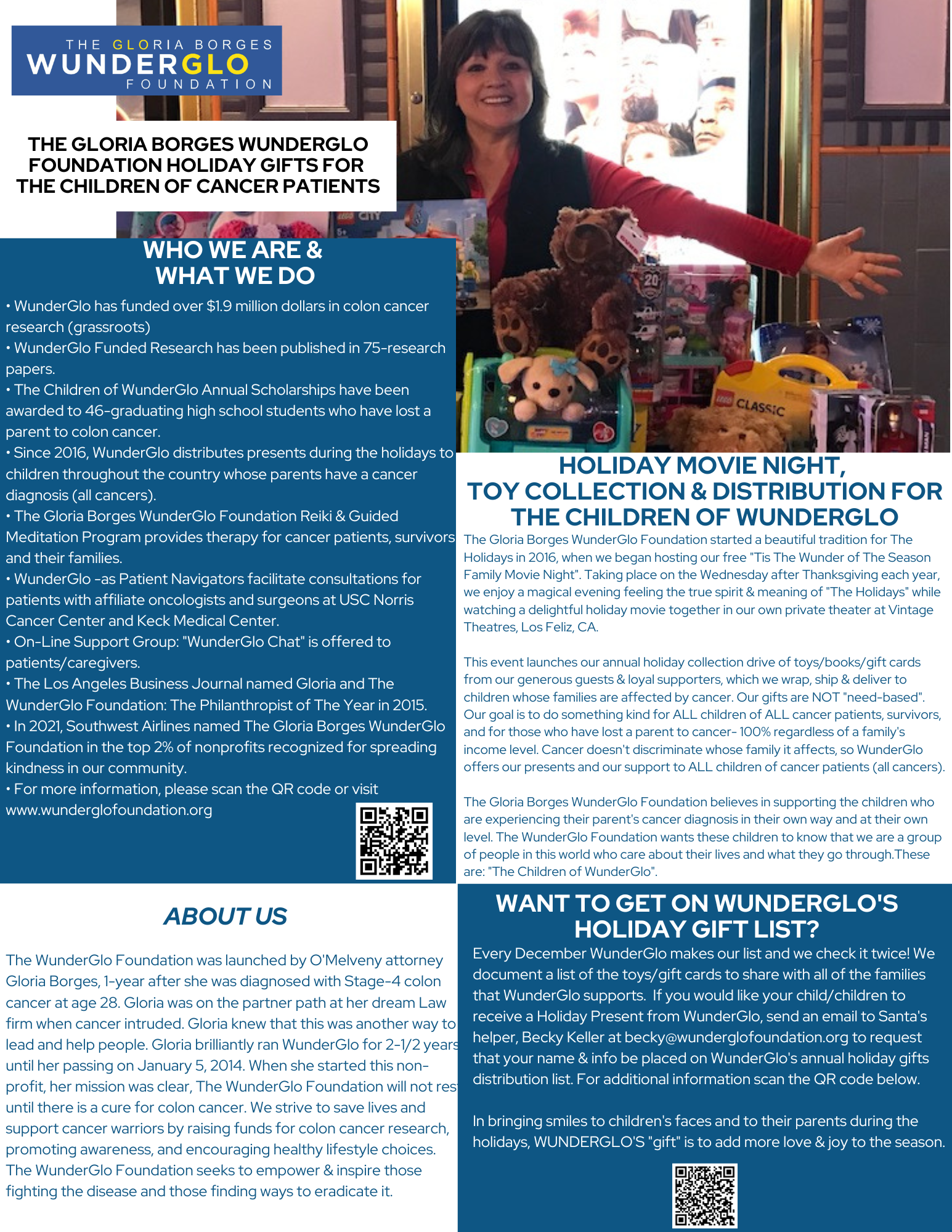 Since 2016, The Gloria Borges WunderGlo Foundation has distributed presents to the children of families affected by colon cancer types for the Holidays in the following communities: Little Canada, Minnesota – Tampico, Illinois – Old Bethpage, New York – Cibolo, Texas – Denver, Colorado – Mountain Lakes, New Jersey, Freehold, New Jersey – Lebanon, Oregon – Lincoln, Nebraska – Prairie Du Sac, Wisconsin – Matthews, North Carolina – Las Vegas, Nevada – Lancaster, Massachusetts – El Reno, Oklahoma – Hamilton, Ohio – Savannah, Georgia – Hershey, Pennsylvania – Seattle, Renton – and Lynwood, Washington.